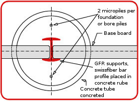 Foundations The design of the foundation is displayed in the SBB catalogue (diagram A-13). Foundations with bored piles and a well collar are an economical solution. Unlike traditional steel posts, the Swissfiber bar b can be directly cemented into the well collar and come into contact with soil without the risk of corrosion. |