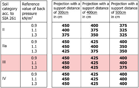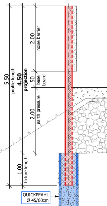 The profile length of the Swissfiber bar b is 550 cm long and comprise the projection length (overhang) and the insert. The insert length (support in foundation) is 100 cm. The projection length (the visible section) of max. 450 cm is broken down into the noise barrier (200 cm), the base board (50 cm) and the foundation (200 cm). These dimensions are, however, dependent on the type of landscape, the dynamic pressure and the distance between supports.