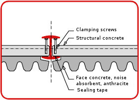 Wall elements The Swissfiber bar b is designed for use with traditional noise barrier elements. When the concrete noise barrier elements are inserted in between the Swissfiber bar b flanges, a protective non-slip spacer is inserted on both sides and removed before fastening the concrete elements. |