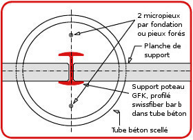 Fondation La réalisation de la fondation est représentée dans le catalogue des types des CFF dans l’illustration A-13. Une réalisation des fondations en pieux forés coiffés d’un caisson se propose comme une solution économique. Contrairement à des poteaux classiques en acier, la Swissfiber bar b peut être coulée dans du béton dans le caisson sans risques de corrosion à cause du contact avec la terre. |