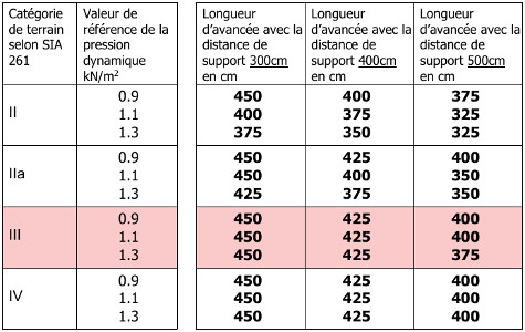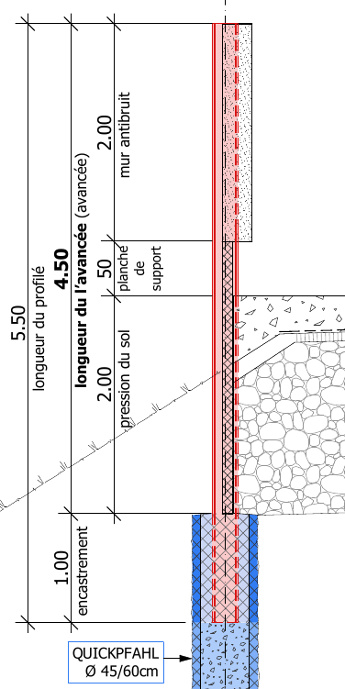 La longueur du profilé Swissfiber bar b est de 550 cm et se compose de la longueur du l’avancée (avancée) et de l’encastrement. L’encastrement (support dans la fondation) est de 100 cm. L’avancée (partie visible) d’un max. de 450 cm est répartie en 200 cm de mur antibruit, en 50 cm de planche de support et en 200 cm de pression du sol. Cependant, ces dimensions dépendent de la catégorie de terrain, de la pression dynamique et des intervalles entre les supports.