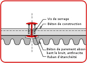 Parois La Swissfiber bar b est dimensionnée de telle façon que les mêmes parois de murs antibruit que pour les versions classiques puissent être utilisées. Lors de la mise en place des éléments antibruit en béton entre les brides de la Swissfiber bar b, il faut utiliser des deux côtés un rail de glissement ou de protection qui sera à nouveau ôté avant le blocage des éléments en béton. |