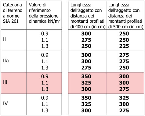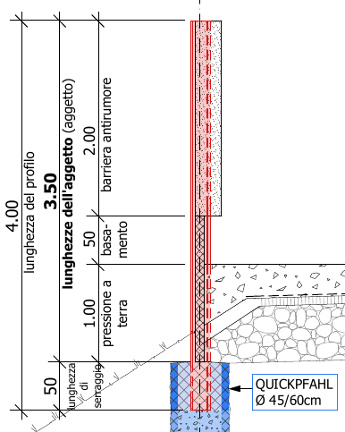 La lunghezza dei profilati Swissfiber bar s è di 400 cm e si stabilisce complessivamente dalla lunghezza dell’aggetto (aggetto) e dell'incastro. La lunghezza di serraggio (montante inserito nella fondazione) è di 50 cm. La lunghezza dell’aggetto (parte visibile) di max. 350 cm si divide in 200 cm di barriera antirumore, 50 cm di basamento e 100 cm di pressione a terra. Tuttavia queste misure dipendono dalla categoria del terreno, dalla pressione dinamica e dalle distanze dei montanti profilati.