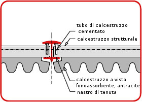 Elementi parete Swissfiber bar s è concepito in modo tale che possono essere impiegati gli stessi elementi per barriere antirumore delle esecuzioni tradizionali. Inserendo un elemento antirumore di cemento tra le flange di Swissfiber bar s, è necessario inserire da entrambi i lati una guida anti-scivolo o di protezione, che deve essere poi rimossa prima del bloccaggio degli elementi in calcestruzzo. |